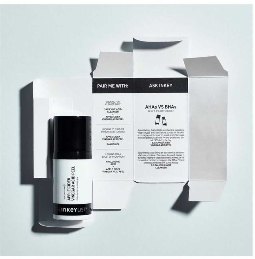 Introducing THE INKEY LIST's all-new and utterly must-have Apple Cider Vinegar Peel. Boasting a potent blend of 2% apple cider vinegar, 10% glycolic acid and a 5% multi-fruit blend, this fast-acting peel guarantees visibly brighter, clearer and smoother skin that's also protected and healthy. P.S - this isn't just for your face, apply this as a targeted treatment to blemish-prone areas of concern such as your back or chest for visible results too.